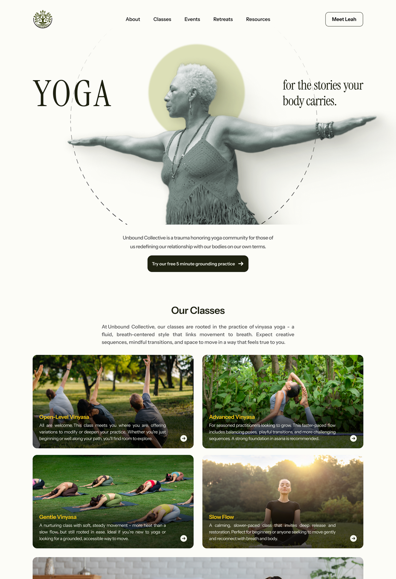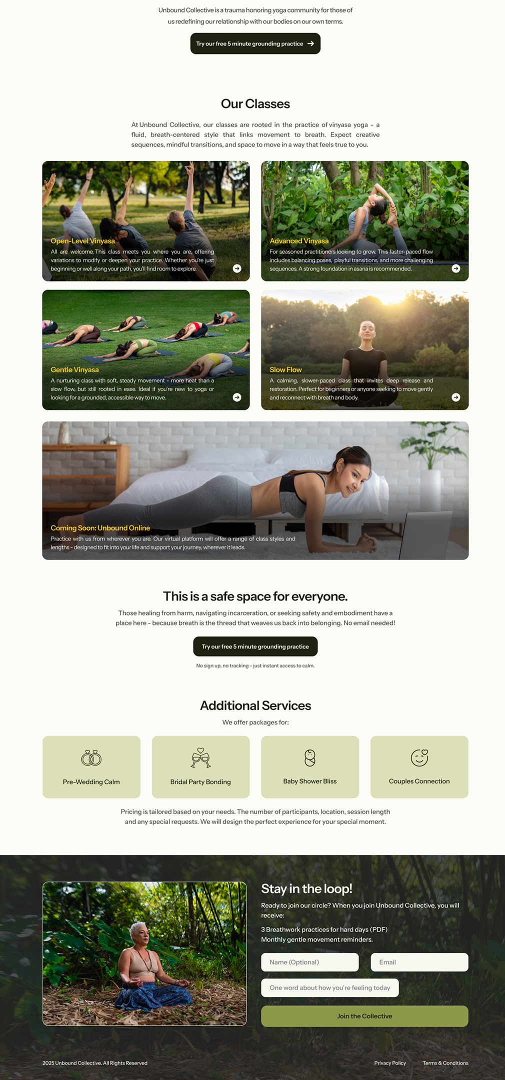 Unbound Collective is a trauma-informed yoga community designed for those who carry their history within their bodies. With classes primarily held outdoors, the visual direction was heavily guided by three pillars: symmetry, calm, and nature. Central to this was the concept of being “rooted”. In a yoga practice, finding your roots is about more than physical balance; it’s a g rounding process of returning to the self and finding stability when the world feels unpredictable. I intended to mirror that transition from the internal noise of trauma to the steady, tactile reality of earth underfoot.
